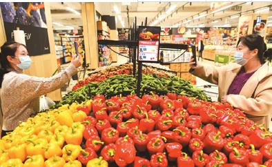 在安徽省阜阳市颍东区永辉超市世纪金源店蔬菜专区,市民通过手机扫码了解购买蔬菜的详细信息。