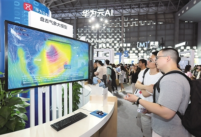 在2023世界人工智能大会上,人们在观看华为云盘古气象大模型。
